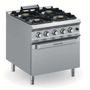 Forno a gas: dotato di bruciatore da 7 kW (10 kW per forno maxi) a fiamma auto-stabilizzata; regolazione termostatica della temperatura con valvola di sicurezza e termocoppia; accensione piezoelettrica del bruciatore. Reggigriglie per 3 GN2/1.