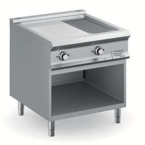La piastra di cottura incassata nel piano è in acciaio dolce, con finitura levigata o al cromo duro, ed ha spessore di 15 mm. Tappo in teflon (optional) facilmente amovibile, per facilitare le operazioni di pulizia e lo scarico dei grassi in un cassetto estraibile in acciaio inox con capacità fino a 2,5 litri.