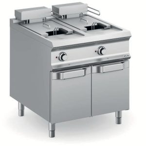 Le vasche in acciaio inox AISI 304 18/10, stampate e con angoli arrotondati, sono fissate al piano con saldatura continua per facilitare le operazioni di pulizia e sanificazione. Tutti i modelli sono dotati di termostato di sicurezza e regolazione termostatica della temperatura dell’olio per mantenere la temperatura dell’olio entro parametri di sicurezza.