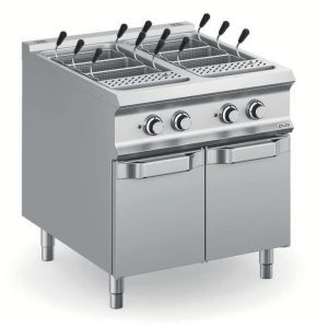 Le vasche stampate sono in acciaio inox AISI 316 anti-corrosione, con ampie raggiature per una facile pulizia. I cestelli colapasta (optional), sono in acciaio inox AISI 304 18/10 con maniglia termica.